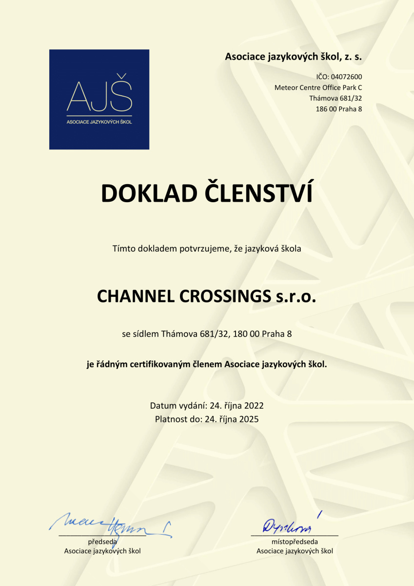 - Cena v sobě zahrnuje: Cena zahrnuje kvalifikovaného a kvalitního lektora, výuku v učebnách Channel Crossings, výukové plány na míru, úvodní testování zdarma, pravidelné měření pokroku.